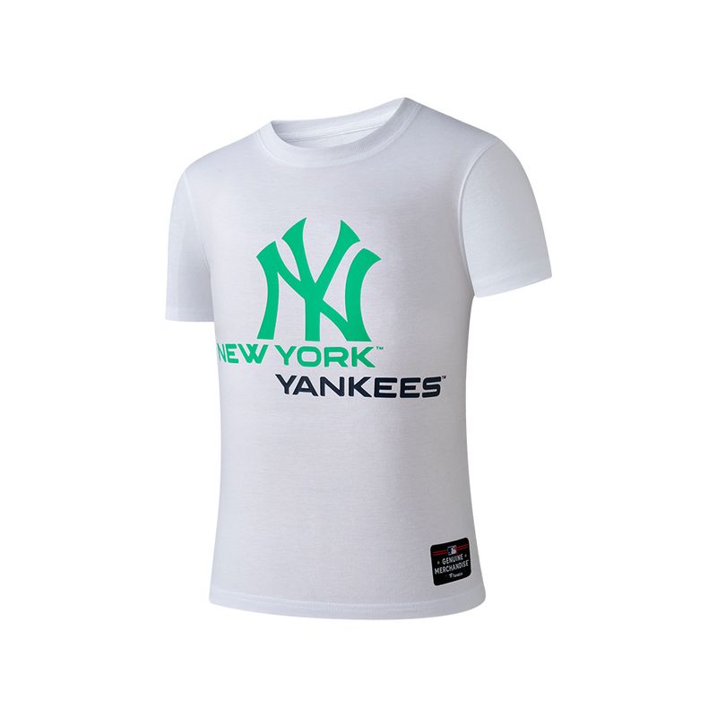 Esta camiseta oficial de los New York Yankees combina el icónico logotipo "NY" con un moderno y llamativo tono verde menta. Diseñada para niños, ofrece comodidad y estilo para lucir la lealtad al equipo en el día a día o durante los partidos. Presenta el logotipo de las iniciales "NY" entrelazadas en un vibrante color verde menta, y el texto "NEW YORK YANKEES" en la parte inferior en azul marino, sobre una base blanca. Confeccionada en polyester para un tacto suave y una comodidad transpirable. Corte regular fit con cuello redondo y mangas cortas, ideal para un look deportivo y versátil.